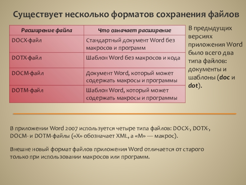 В приложении Word 2007 используется четыре типа файлов: DOCX-, DOTX-, DOCM- и DOTM-файлы («X» обозначает XML, а «M» — макрос).