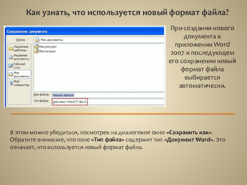 В этом можно убедиться, посмотрев на диалоговое окно «Сохранить как». Обратите внимание, что поле «Тип файла» содержит тип «Документ Word». Это означает, что используется новый формат файла.