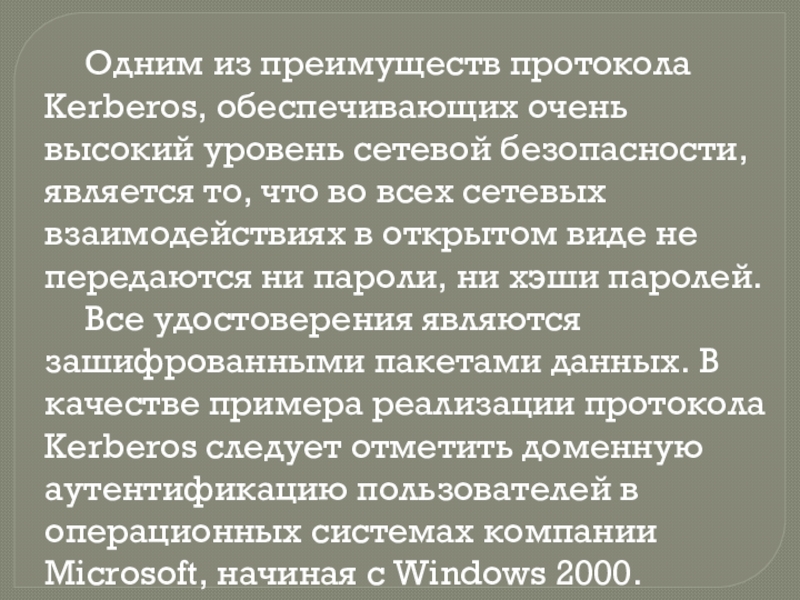 Слайд 37 Одним из преимуществ протокола Kerberos, обеспечивающих очень высокий уровень сетевой
