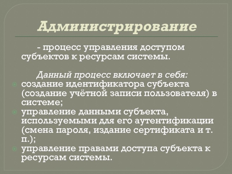 Для каждого субъекта в системе определяется набор прав, которые он может использовать при обращении к её ресурсам.