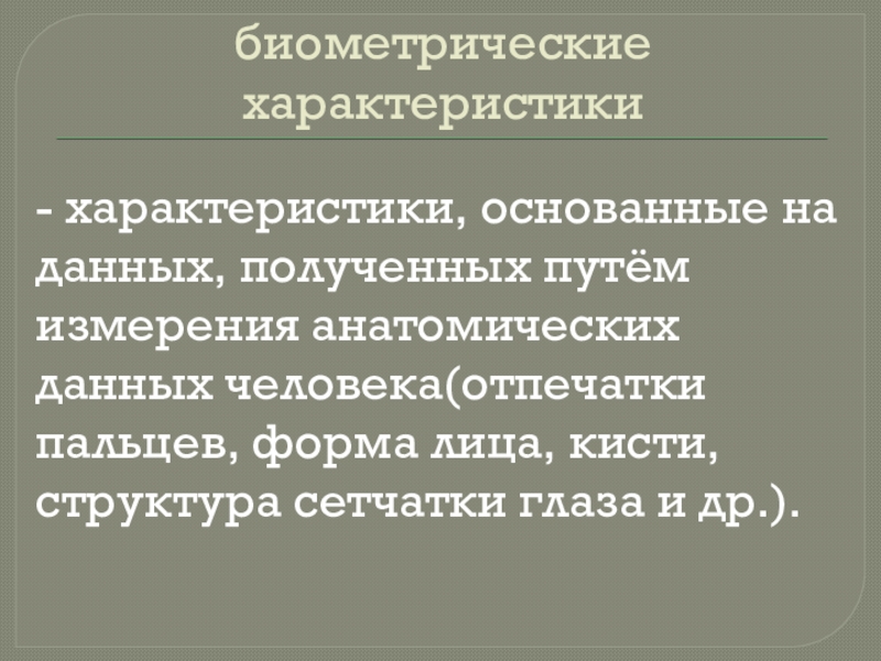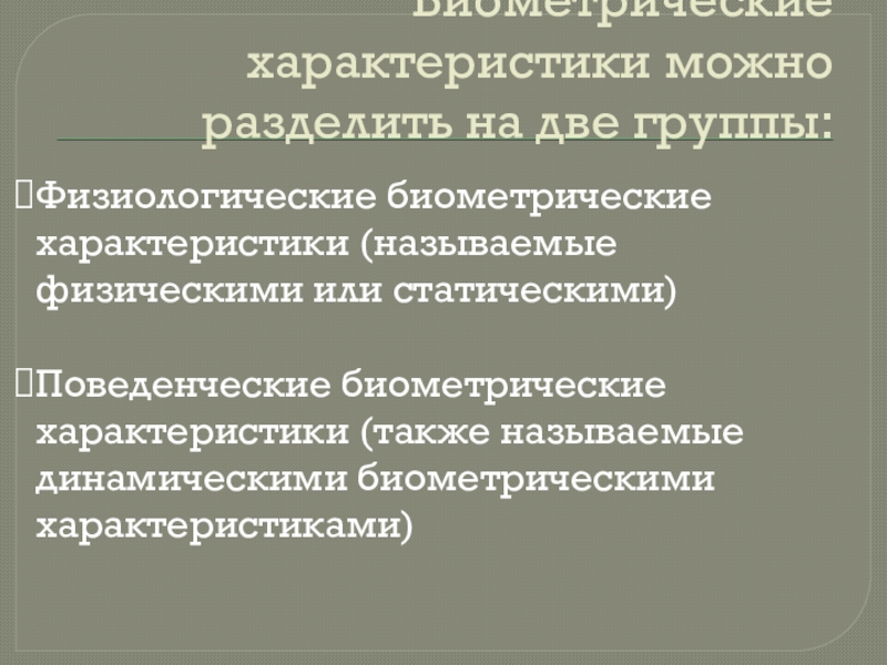 Слайд 21Биометрические характеристики можно разделить на две группы: