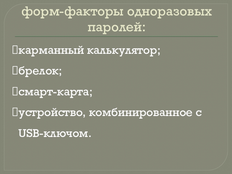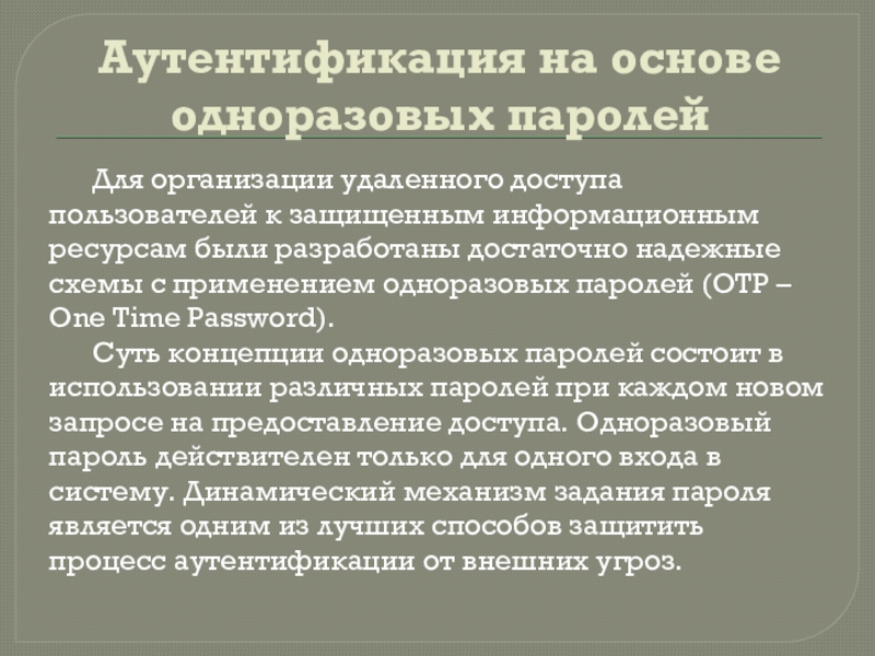 Суть концепции одноразовых паролей состоит в использовании различных паролей при каждом новом запросе на предоставление доступа. Одноразовый пароль действителен только для одного входа в систему. Динамический механизм задания пароля является одним из лучших способов защитить процесс аутентификации от внешних угроз.