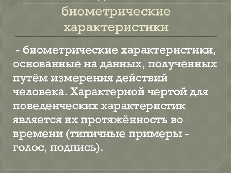 путём измерения действий человека. Характерной чертой для поведенческих характеристик является их протяжённость во времени (типичные примеры - голос, подпись).