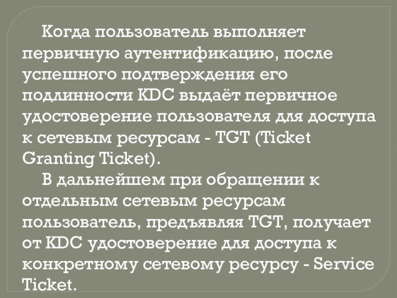 Слайд 36 Когда пользователь выполняет первичную аутентификацию, после успешного подтверждения его подлинности KDC