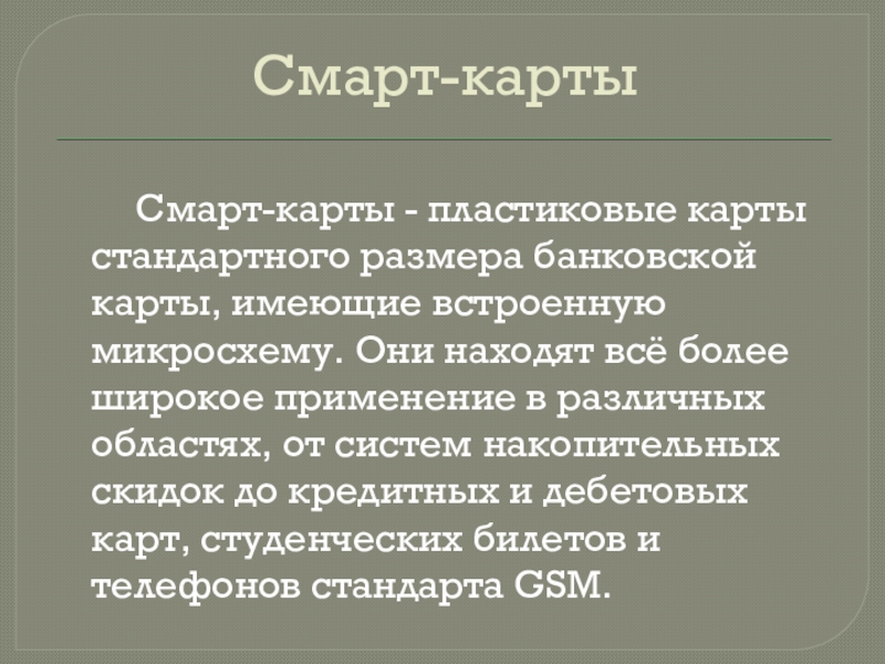 Смарт-карты - пластиковые карты стандартного размера банковской карты, имеющие встроенную