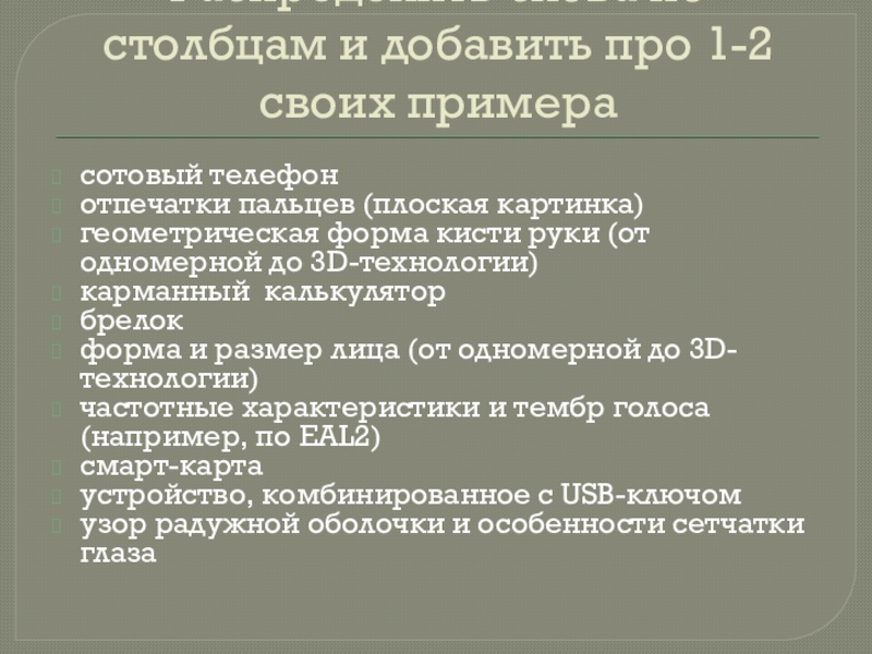 Слайд 48Распределить слова по столбцам и добавить про 1-2 своих примера