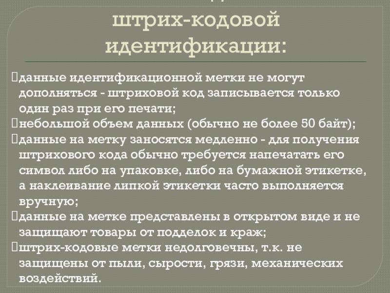 Слайд 17Основные недостаткам штрих-кодовой идентификации: