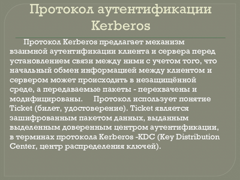 сервера перед установлением связи между ними с учетом того, что начальный обмен информацией между клиентом и сервером может происходить в незащищённой среде, а передаваемые пакеты - перехвачены и модифицированы. Протокол использует понятие Ticket (билет, удостоверение). Ticket является зашифрованным пакетом данных, выданным выделенным доверенным центром аутентификации, в терминах протокола Kerberos -KDC (Key Distribution Center, центр распределения ключей).