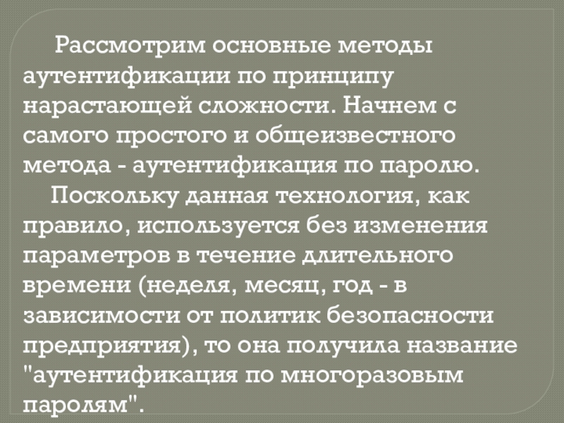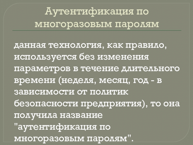 в течение длительного времени (неделя, месяц, год - в зависимости от политик безопасности предприятия), то она получила название "аутентификация по многоразовым паролям".