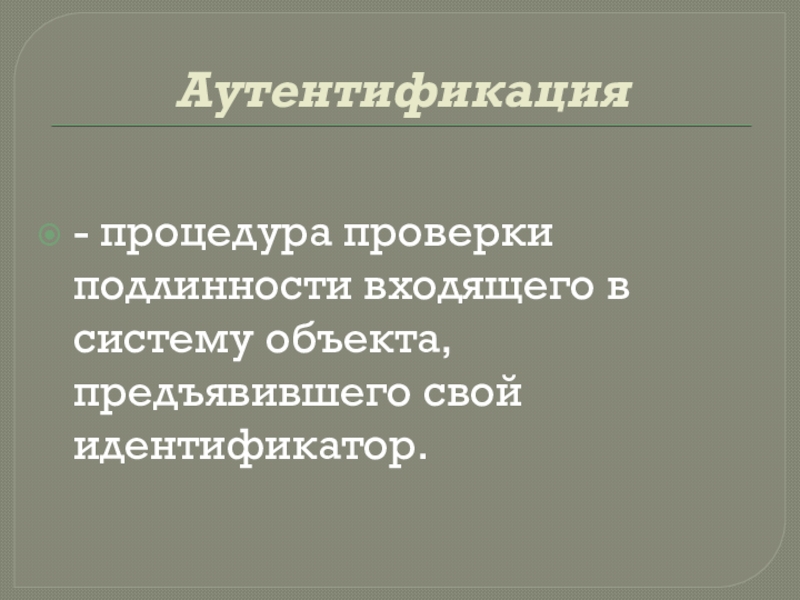 - процедура проверки подлинности входящего в систему объекта, предъявившего свой идентификатор.