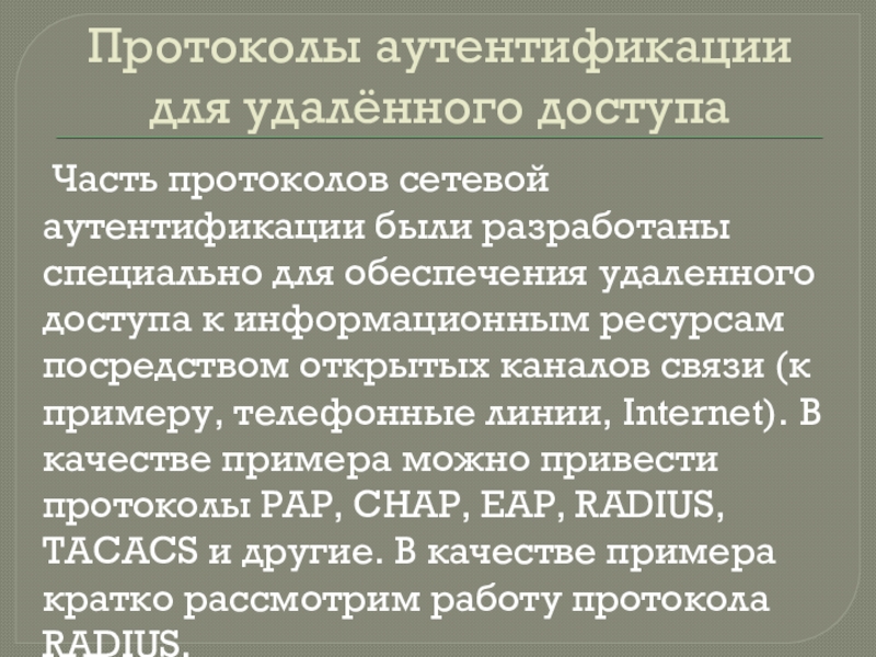 специально для обеспечения удаленного доступа к информационным ресурсам посредством открытых каналов связи (к примеру, телефонные линии, Internet). В качестве примера можно привести протоколы PAP, CHAP, EAP, RADIUS, TACACS и другие. В качестве примера кратко рассмотрим работу протокола RADIUS.