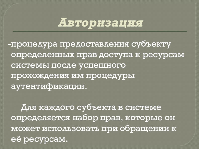 процедура предоставления субъекту определенных прав доступа к ресурсам системы после успешного