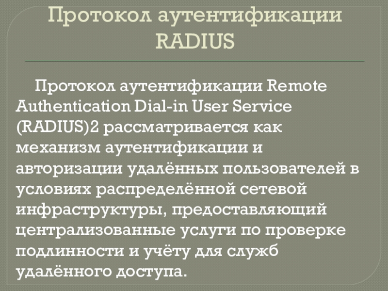 рассматривается как механизм аутентификации и авторизации удалённых пользователей в условиях распределённой сетевой инфраструктуры, предоставляющий централизованные услуги по проверке подлинности и учёту для служб удалённого доступа.