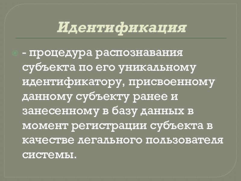 - процедура распознавания субъекта по его уникальному идентификатору, присвоенному данному субъекту