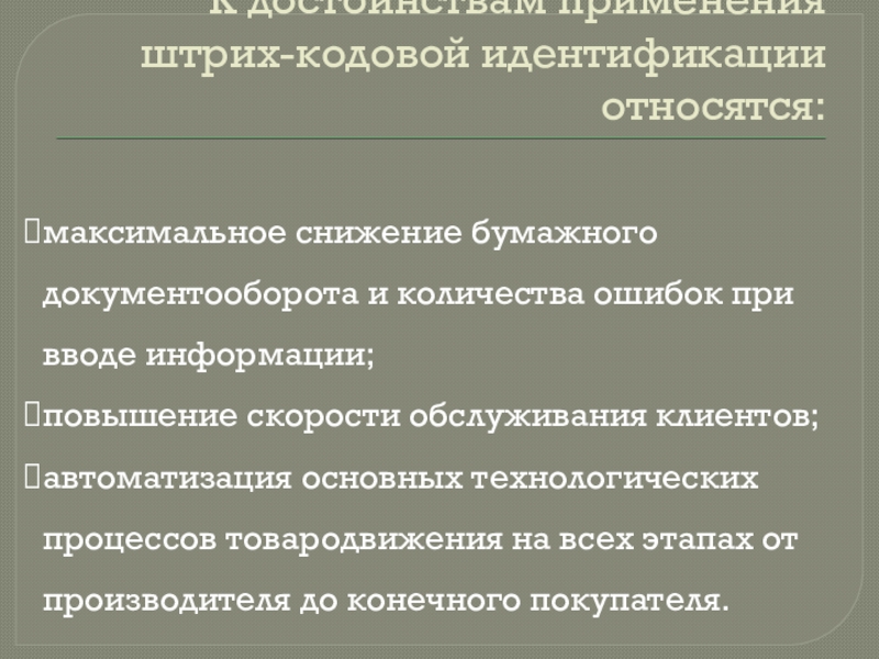 Слайд 16 К достоинствам применения штрих-кодовой идентификации относятся: