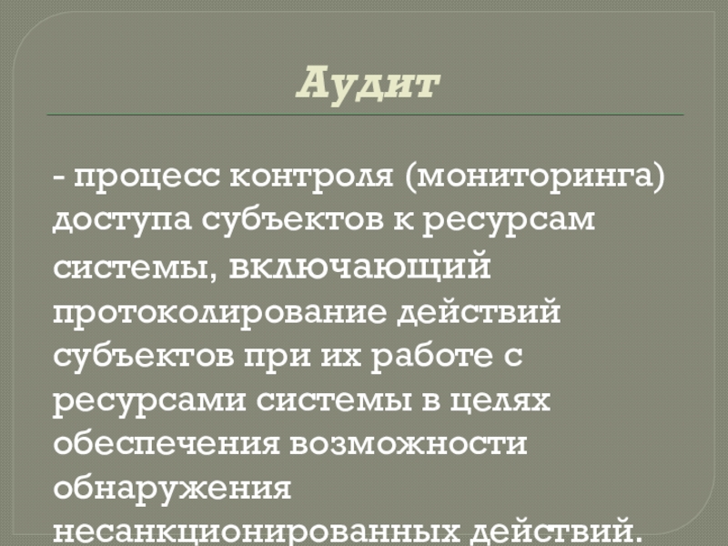 - процесс контроля (мониторинга) доступа субъектов к ресурсам системы, включающий протоколирование