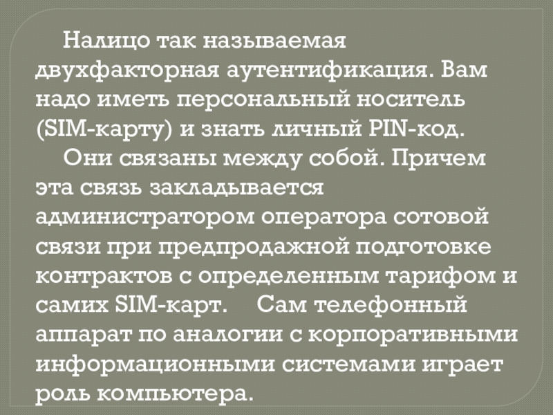 Слайд 29 Налицо так называемая двухфакторная аутентификация. Вам надо иметь персональный носитель (SIM-карту)