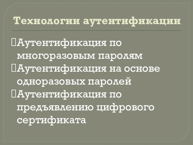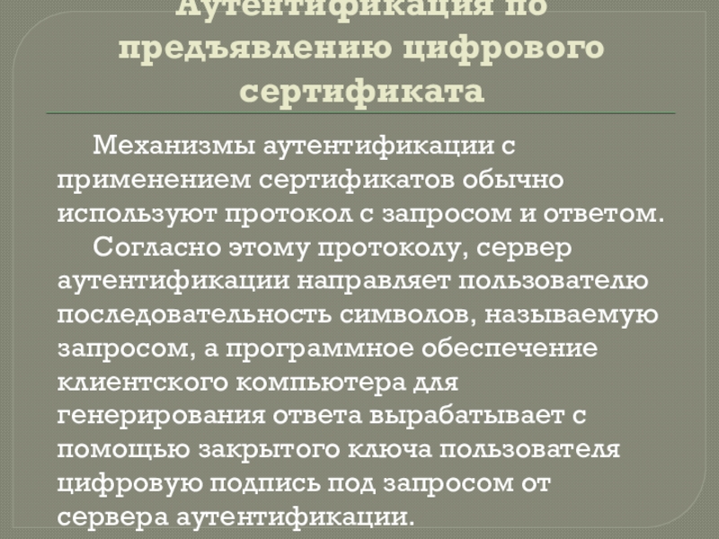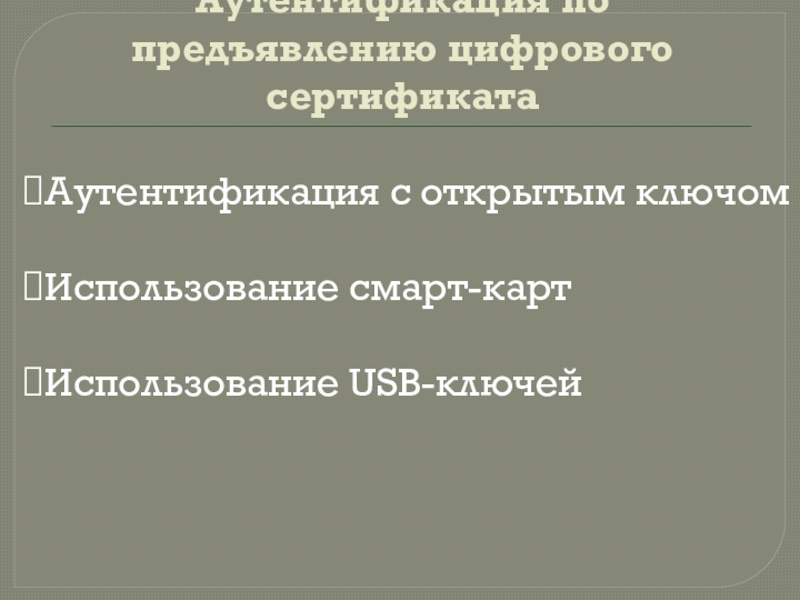 Слайд 43Аутентификация по предъявлению цифрового сертификата