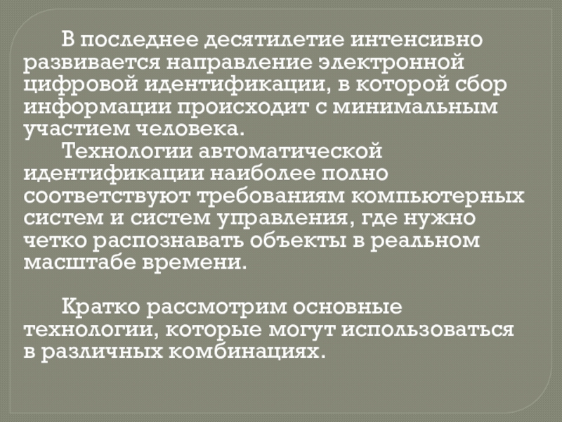 Технологии автоматической идентификации наиболее полно соответствуют требованиям компьютерных систем и систем управления, где нужно четко распознавать объекты в реальном масштабе времени.