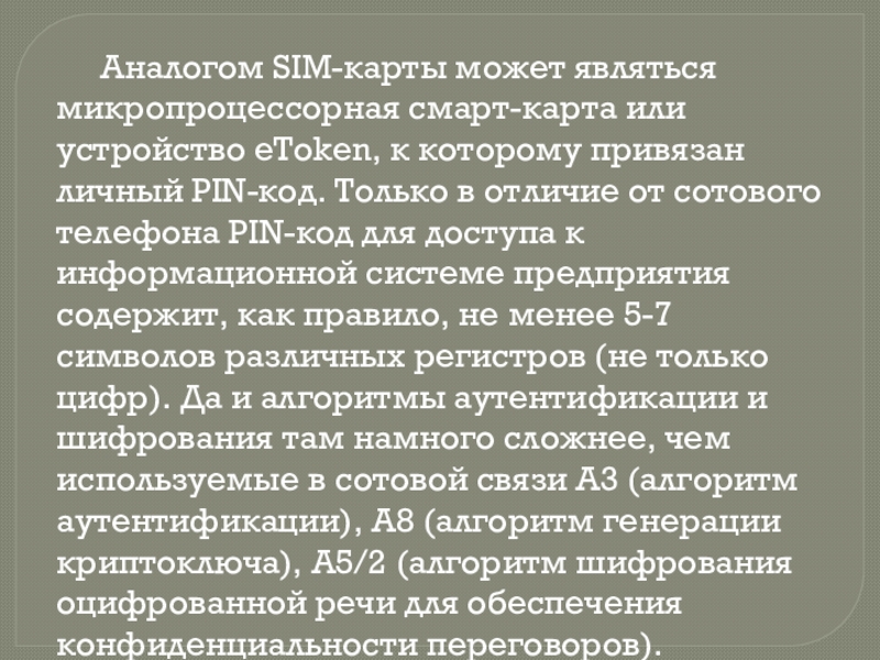 привязан личный PIN-код. Только в отличие от сотового телефона PIN-код для доступа к информационной системе предприятия содержит, как правило, не менее 5-7 символов различных регистров (не только цифр). Да и алгоритмы аутентификации и шифрования там намного сложнее, чем используемые в сотовой связи A3 (алгоритм аутентификации), А8 (алгоритм генерации криптоключа), А5/2 (алгоритм шифрования оцифрованной речи для обеспечения конфиденциальности переговоров).