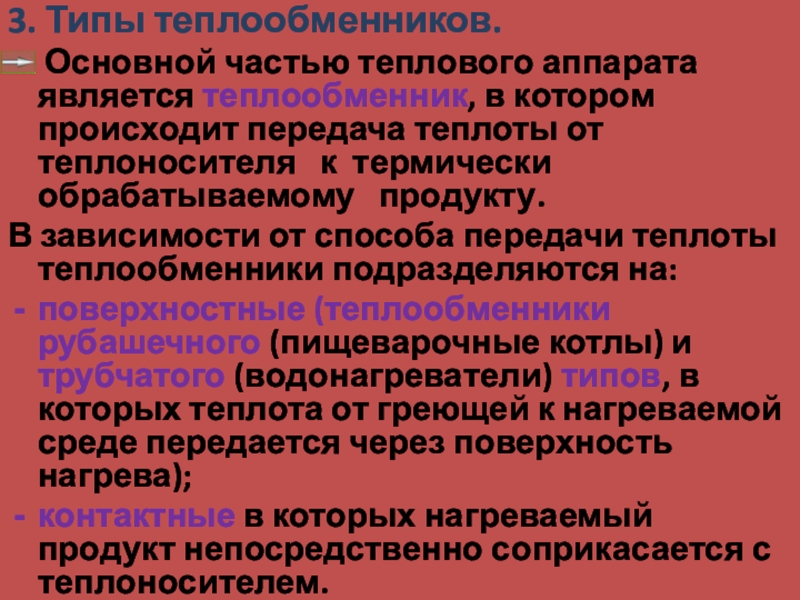 поверхностные (теплообменники рубашечного (пищеварочные котлы) и трубчатого (водонагреватели) типов, в которых теплота от греющей к нагреваемой среде передается через поверхность нагрева);