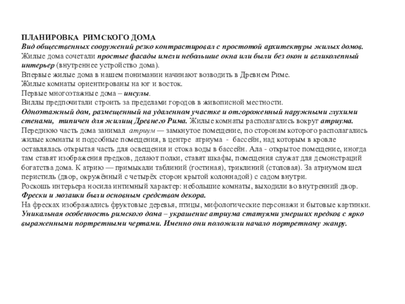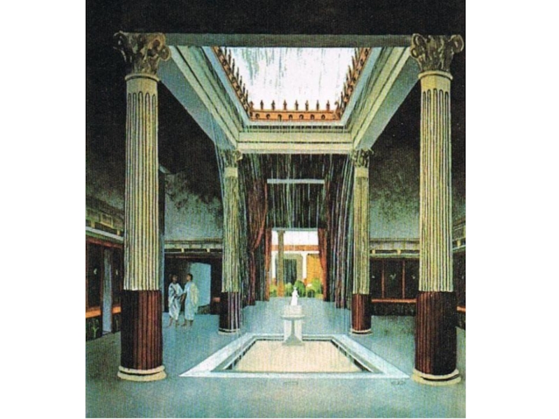 Переднюю часть дома занимал атриум — замкнутое помещение, по сторонам которого располагались жилые комнаты и подсобные помещения, в центре атриума - бассейн, над которым в кровле оставлялась открытая часть для освещения и стока воды в бассейн. Ала - открытое помещение, иногда там ставят изображения предков, делают полки, ставят шкафы, помещения служат для демонстраций богатства дома. К атрию — примыкали таблиний (гостиная), триклиний (столовая). За атриумом шел перистиль (двор, окружённый с четырёх сторон крытой колоннадой) с садом внутри.