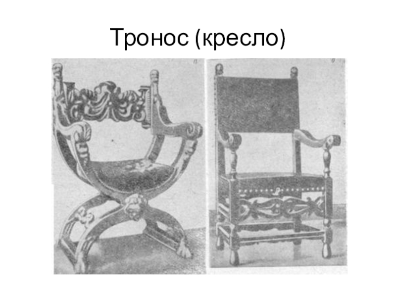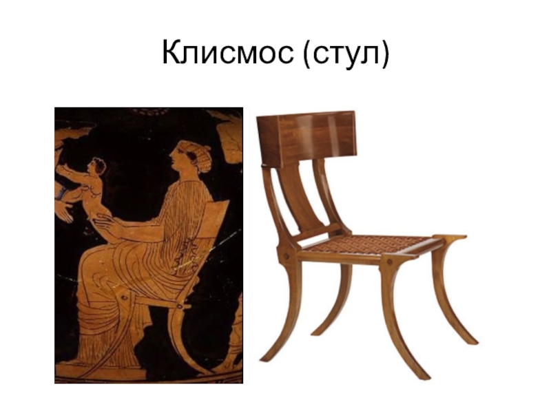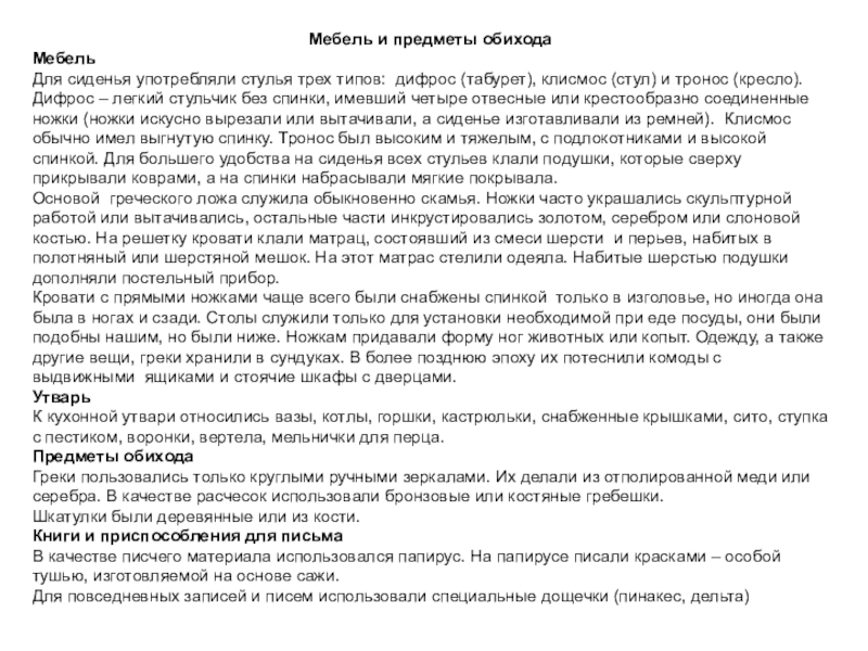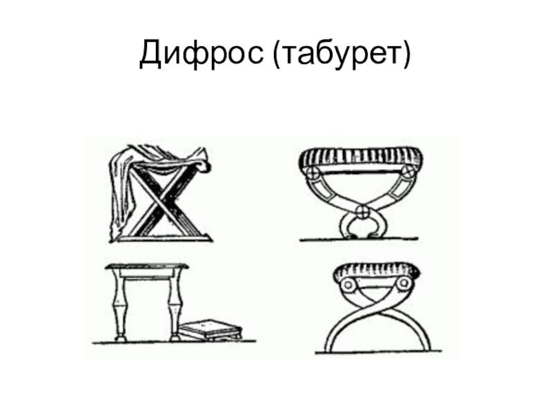 (табурет), клисмос (стул) и тронос (кресло). Дифрос – легкий стульчик без спинки, имевший четыре отвесные или крестообразно соединенные ножки (ножки искусно вырезали или вытачивали, а сиденье изготавливали из ремней). Клисмос обычно имел выгнутую спинку. Тронос был высоким и тяжелым, с подлокотниками и высокой спинкой. Для большего удобства на сиденья всех стульев клали подушки, которые сверху прикрывали коврами, а на спинки набрасывали мягкие покрывала.