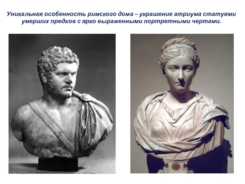 Слайд 18Уникальная особенность римского дома – украшение атриума статуями умерших предков с