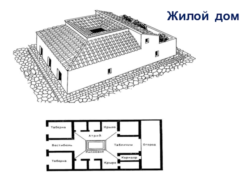 Одноэтажный дом, размещенный на удаленном участке и отгороженный наружными глухими стенами, типичен для жилищ Древнего Рима. Жилые комнаты располагались вокруг атриума.