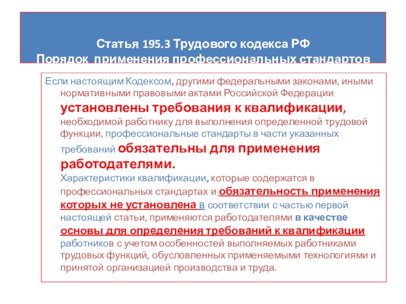 Кодексом, другими федеральными законами, иными нормативными правовыми актами Российской Федерации установлены требования к квалификации, необходимой работнику для выполнения определенной трудовой функции, профессиональные стандарты в части указанных требований обязательны для применения работодателями.