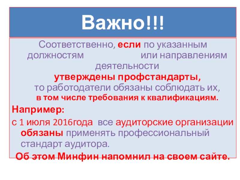 с 1 июля 2016года все аудиторские организации обязаны применять профессиональный стандарт аудитора.