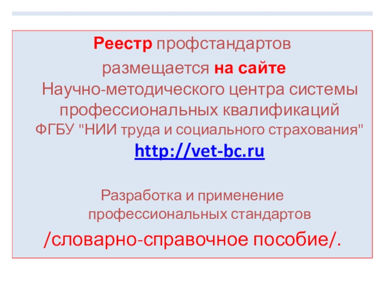 Научно-методического центра системы профессиональных квалификаций ФГБУ "НИИ труда и социального страхования" http://vet-bc.ru