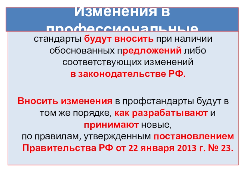 Вносить изменения в профстандарты будут в том же порядке, как разрабатывают и принимают новые, по правилам, утвержденным постановлением Правительства РФ от 22 января 2013 г. № 23.