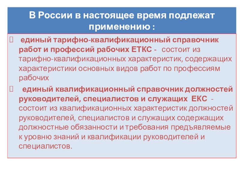 единый квалификационный справочник должностей руководителей, специалистов и служащих ЕКС - состоит из квалификационных характеристик должностей руководителей, специалистов и служащих содержащих должностные обязанности и требования предъявляемые к уровню знаний и квалификации руководителей и специалистов.