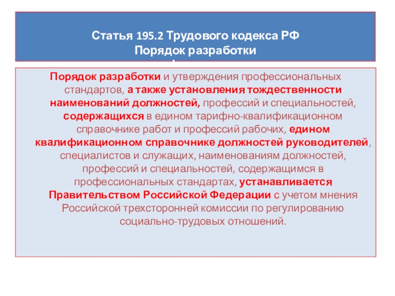 Порядок разработки и утверждения профессиональных стандартов, а также установления тождественности наименований должностей, профессий и специальностей, содержащихся в едином тарифно-квалификационном справочнике работ и профессий рабочих, едином квалификационном справочнике должностей руководителей, специалистов и служащих, наименованиям должностей, профессий и специальностей, содержащимся в профессиональных стандартах, устанавливается Правительством Российской Федерации с учетом мнения Российской трехсторонней комиссии по регулированию социально-трудовых отношений.