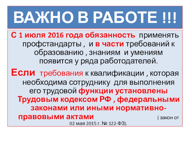 Если требования к квалификации , которая необходима сотруднику для выполнения его трудовой функции установлены Трудовым кодексом РФ , федеральными законами или иными нормативно-правовыми актами ( закон от 02 мая 2015 г. № 122-ФЗ).