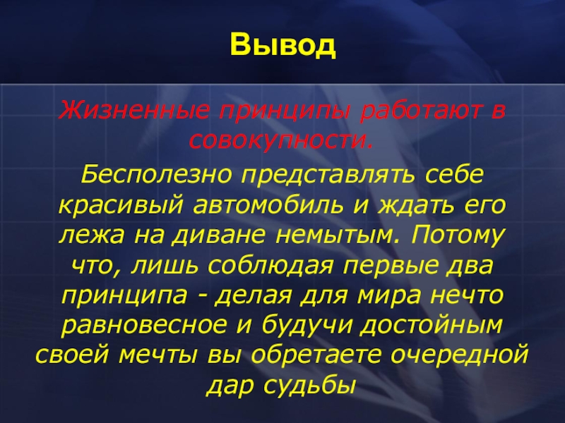 ВыводЖизненные принципы работают в совокупности. Бесполезно представлять себе красивый автомобиль и ждать его лежа на диване немытым.