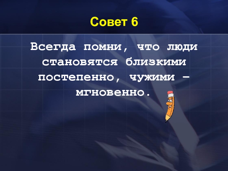 Совет 6Всегда помни, что люди становятся близкими постепенно, чужими – мгновенно.