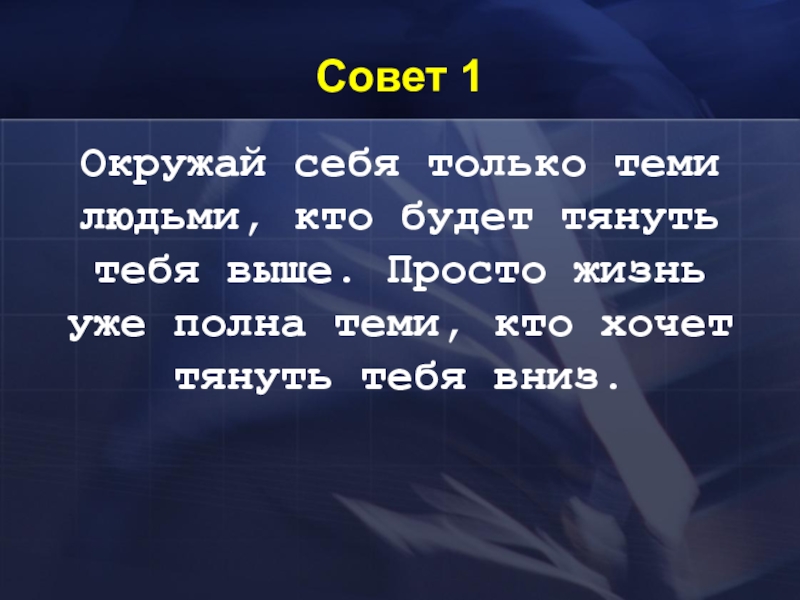 Совет 1Окружай себя только теми людьми, кто будет тянуть тебя выше. Просто жизнь уже полна теми, кто