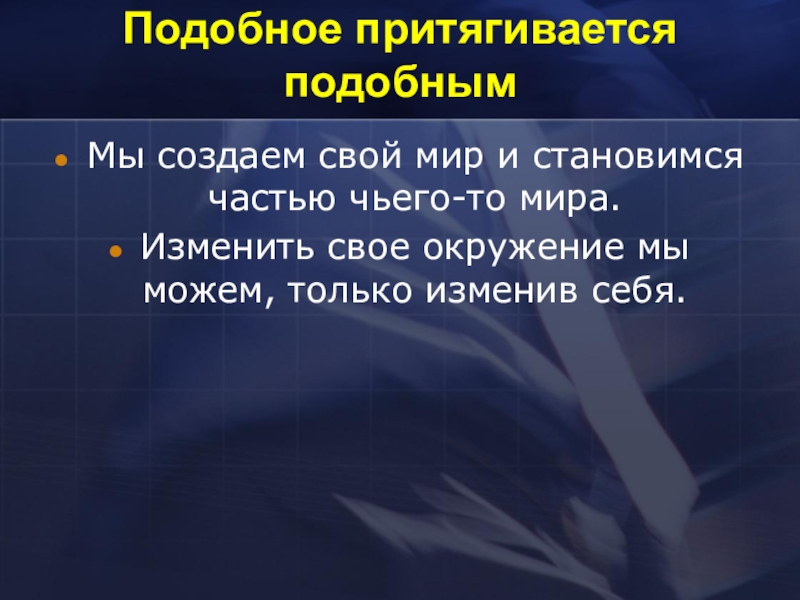 Подобное притягивается подобнымМы создаем свой мир и становимся частью чьего-то мира. Изменить свое окружение мы можем, только
