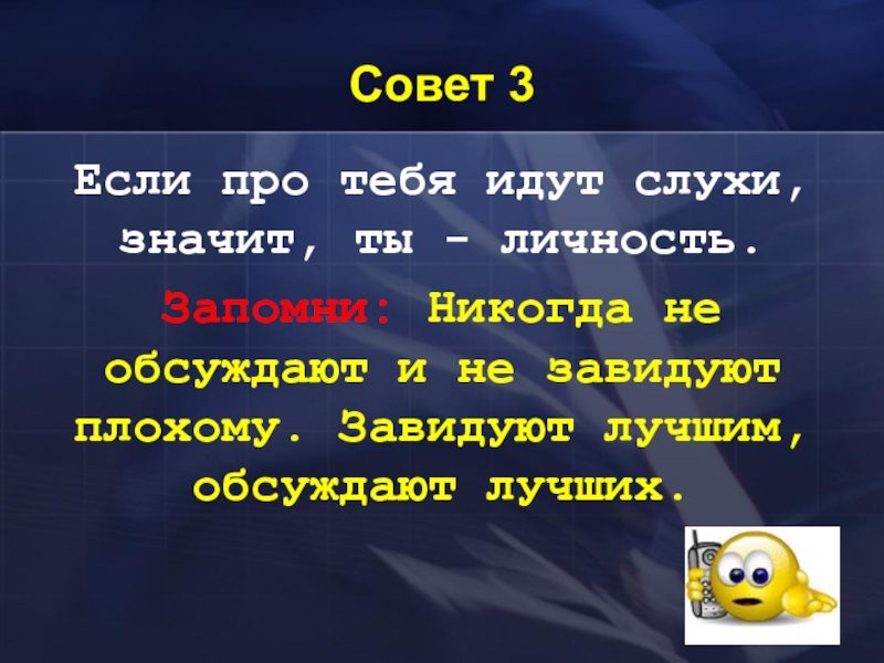 Совет 3Если про тебя идут слухи, значит, ты - личность. Запомни: Никогда не обсуждают и не завидуют
