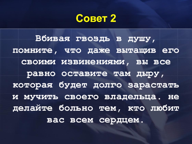 Совет 2Вбивая гвоздь в душу, помните, что даже вытащив его своими извинениями, вы все равно оставите там