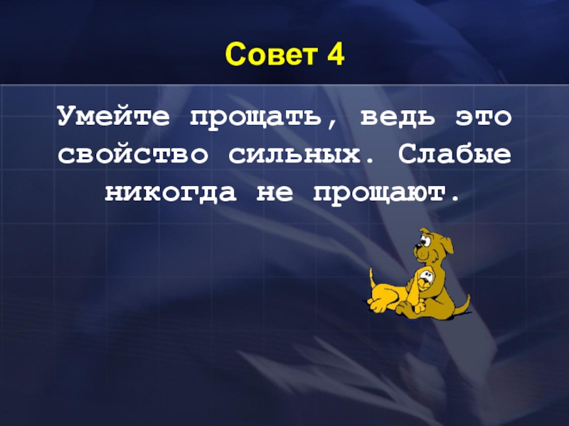 Совет 4Умейте прощать, ведь это свойство сильных. Слабые никогда не прощают.