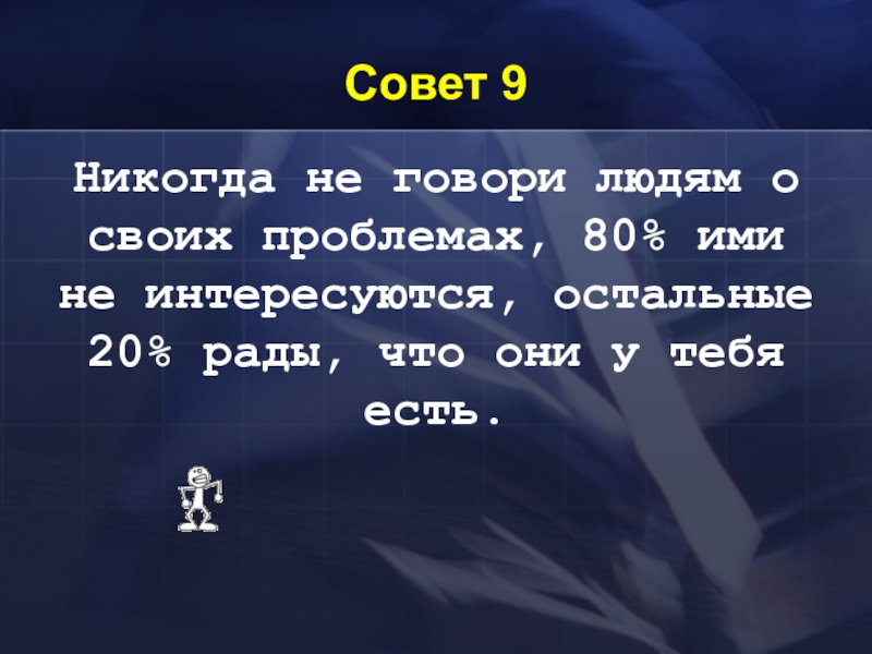 Совет 9Никогда не говори людям о своих проблемах, 80% ими не интересуются, остальные 20% рады, что они