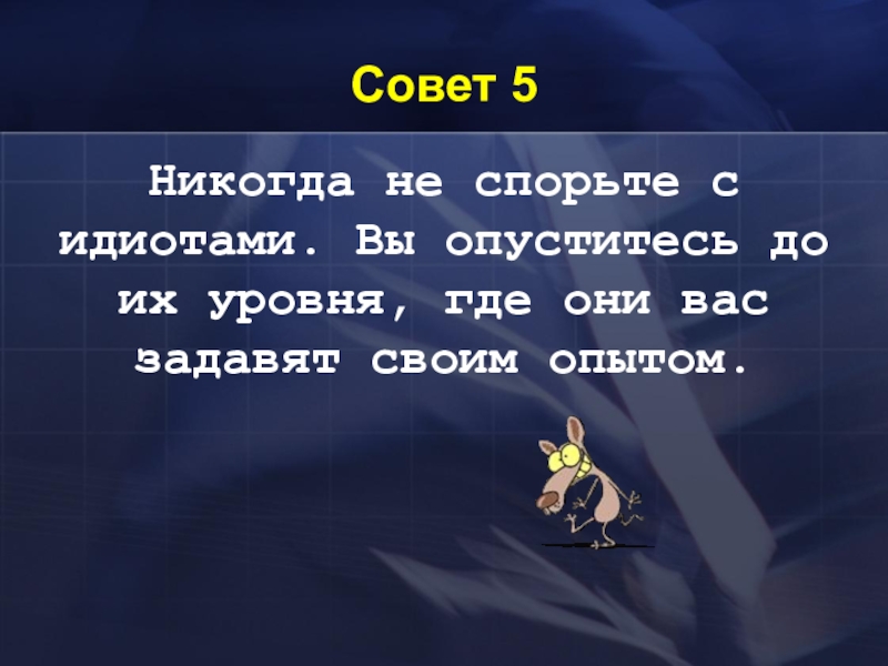 Совет 5Никогда не спорьте с идиотами. Вы опуститесь до их уровня, где они вас задавят своим опытом.