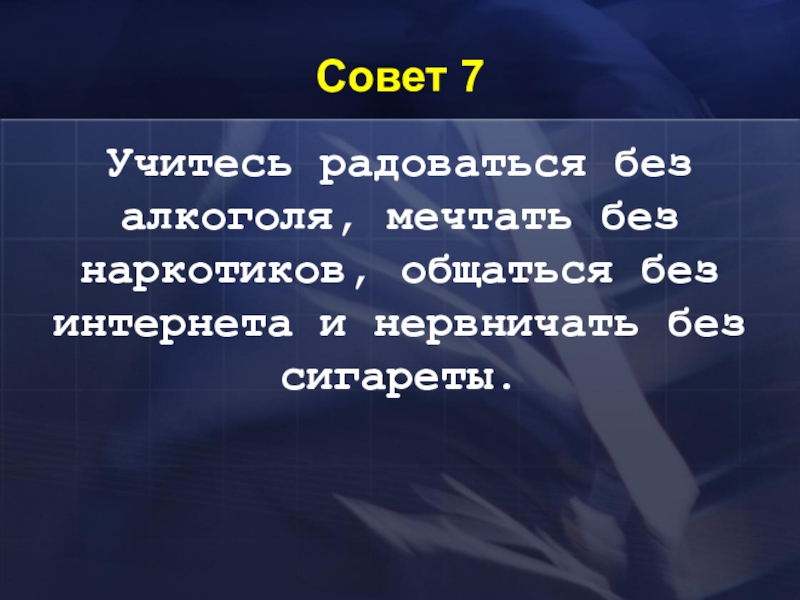 Совет 7Учитесь радоваться без алкоголя, мечтать без наркотиков, общаться без интернета и нервничать без сигареты.