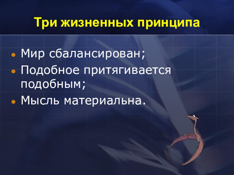 Три жизненных принципаМир сбалансирован;Подобное притягивается подобным;Мысль материальна.