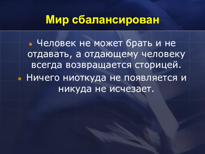 Мир сбалансированЧеловек не может брать и не отдавать, а отдающему человеку всегда возвращается сторицей.Ничего ниоткуда не появляется