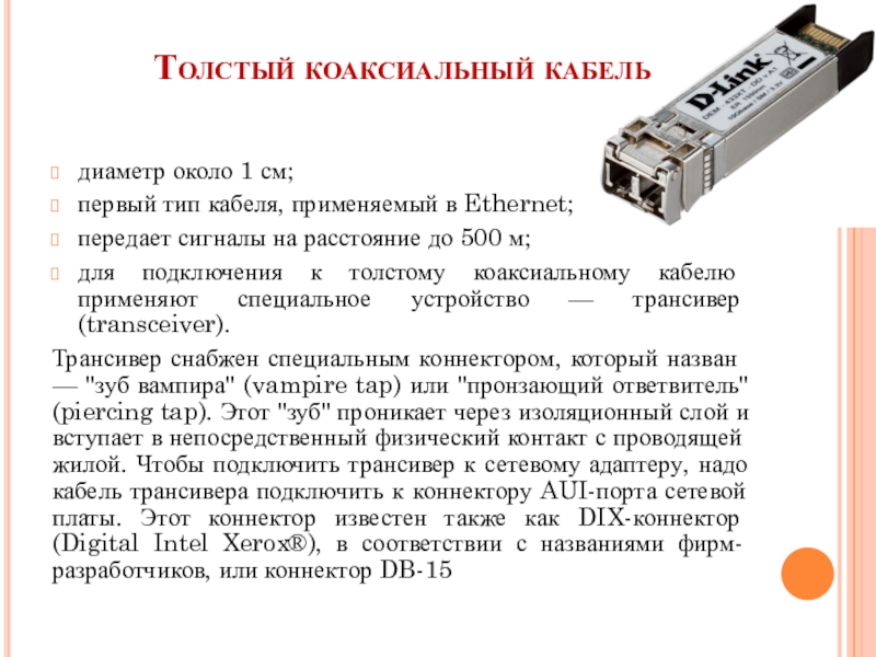 для подключения к толстому коаксиальному кабелю применяют специальное устройство — трансивер (transceiver).