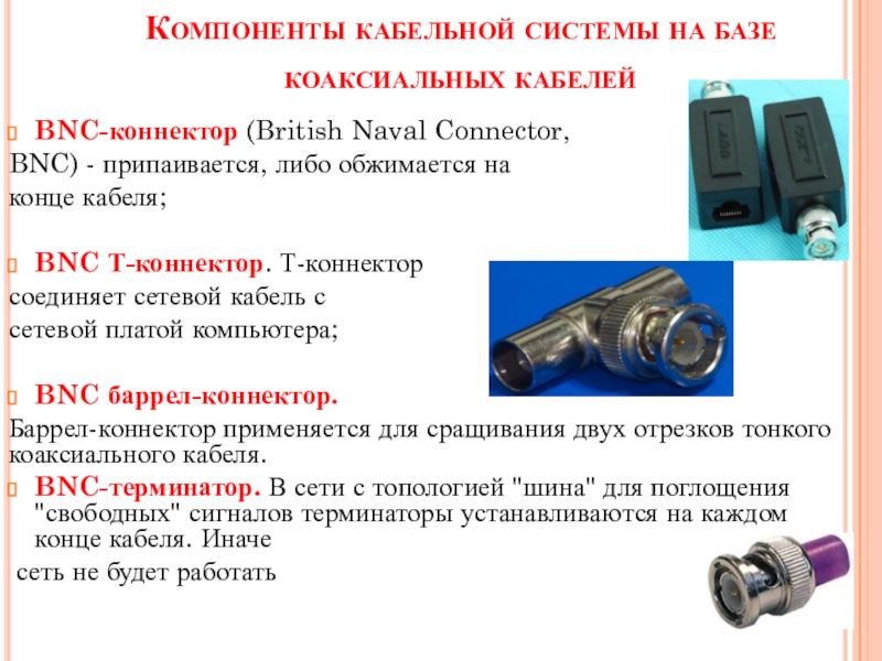 BNC-терминатор. В сети с топологией "шина" для поглощения "свободных" сигналов терминаторы устанавливаются на каждом конце кабеля. Иначе